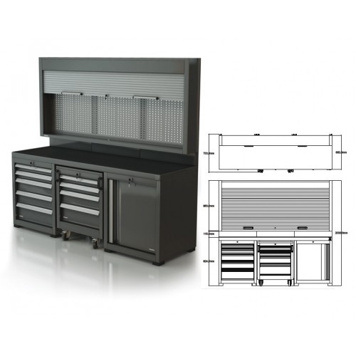 armadietto con anta retraibile. La parte superiore è dotata di pannello murale porta utensili